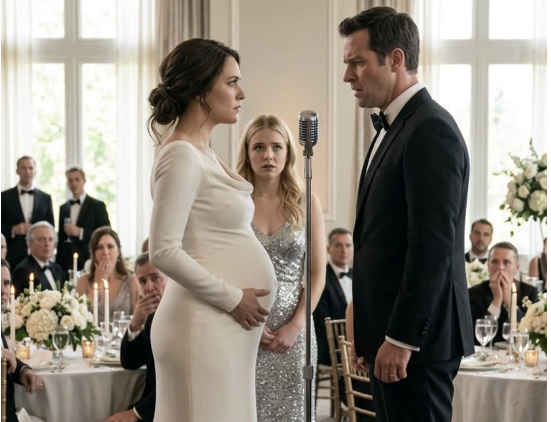 Devant 120 invités stupéfaits, mon mari a repoussé ma main et a soufflé froidement : « Ne m’embarrasse pas—tu n’es qu’une porteuse. » Mon cœur s’est brisé, mais je n’ai rien laissé paraître. J’ai souri comme si de rien n’était, je suis restée là sous les projecteurs avec tout le monde qui regardait, puis j’ai lentement saisi le microphone—car s’il voulait un moment public parfait, il allait entendre la vérité le détruire…….Au moment où les assiettes de dessert ont été posées sur les tables, mes pieds étaient gonflés, mon dos me lançait, et chaque sourire sur mon visage semblait emprunté.