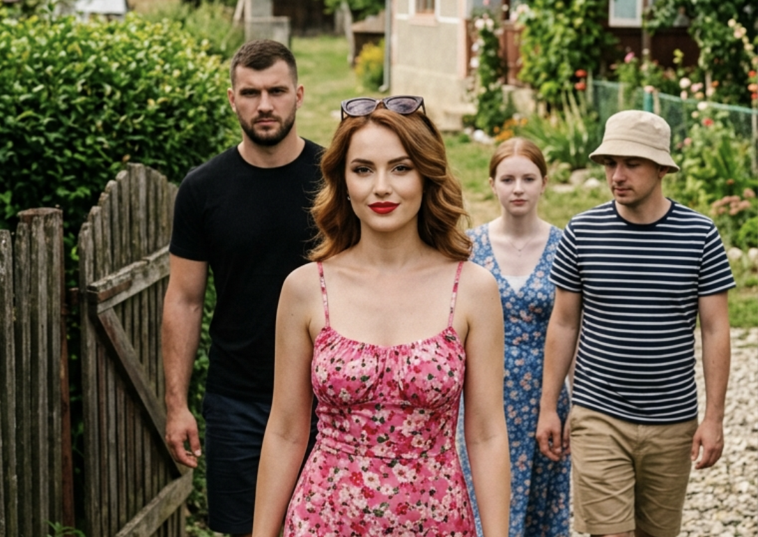 Le portail s’est ouvert. Olesya—en robe d’été, manucure éclatante, lunettes de soleil sur la tête. Derrière elle, Igor—en short, silencieux, imposant. Derrière eux, Vika et Stas. Vika en robe, Stas avec un chapeau Panama.